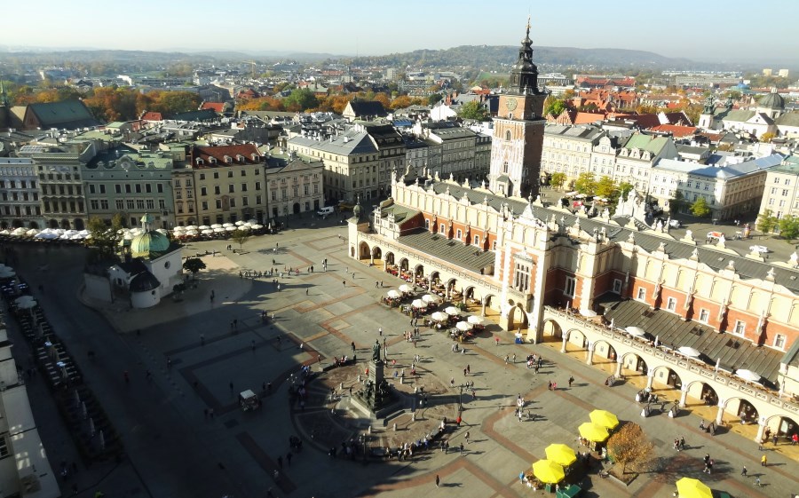 Het grote marktplein heeft een bijzondere vorm voor een Middeleeuwse stadskern: het plein is een keurig, kaarsrecht vierkant. De straten rondom het plein staan in strakke lijnen getekend. Toen de stad in de 13e eeuw verwoest was, is de binnenstad opnieuw opgebouwd in de meest efficiënte vorm uit die tijd. Omdat Krakau een rijke handelsstad was, kreeg het marktplein een belangrijke plaats. Dat moest groot zijn, heel groot, en ook nog goed te bereiken.